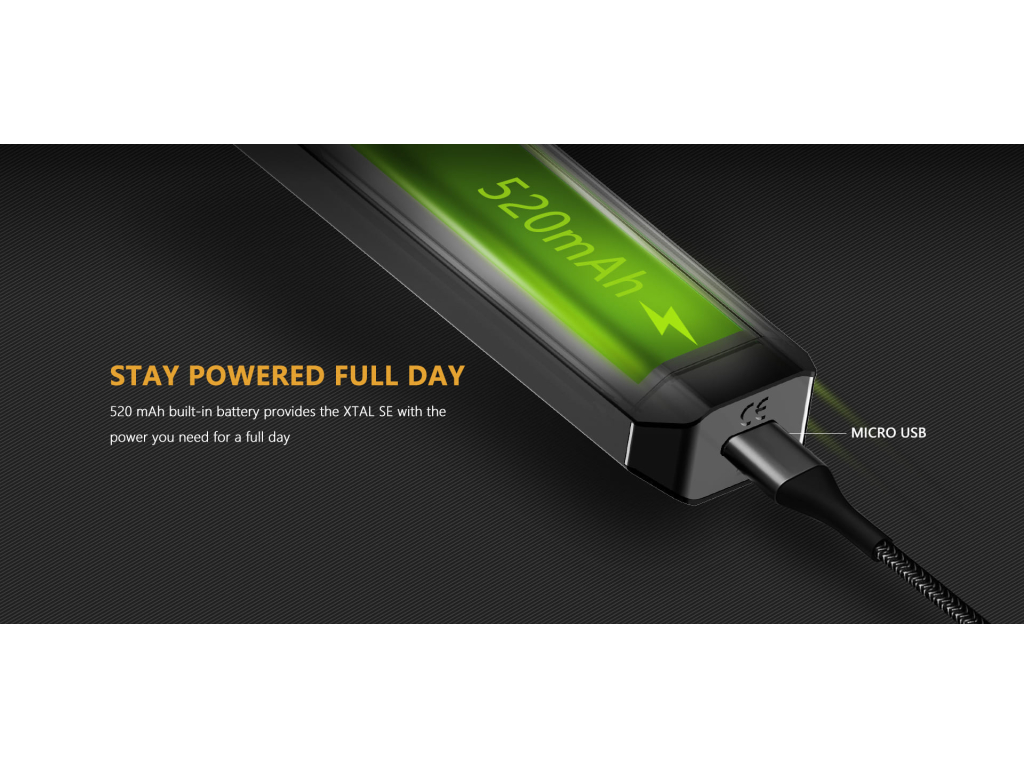 Celá e-cigareta je poháněna vestavěnou baterií s kapacitou 520 mAh, která vám zajistí bezproblémové používání po celý den. Stav baterie jednoduše zjistíte díky indikátorové diodě na přední straně e-cigarety. A když se baterie vybije, jednoduše ji rychle dobijete pomocí micro USB kabelu.